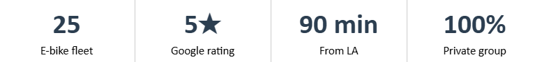 Most Ojai operators max out at 8-12 bikes. Our 25 e-bike fleet is the largest in town — built specifically so we can host your entire group on one private tour, in one day. No splitting people across two days. No "first half goes Saturday, second half goes Sunday.”